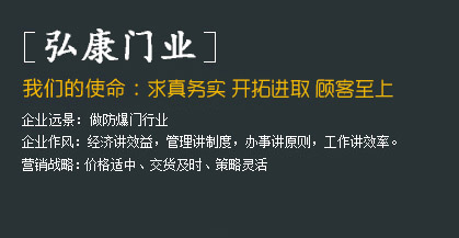 河北弘康門業(yè)有限公司     河北弘康門業(yè)有限公司是一家生產(chǎn)防爆門窗、泄爆門窗、密閉門窗、防火門窗、監(jiān)獄門、隔音門、變壓器門,隧道抗風(fēng)壓防火門,隧道防護(hù)門,3小時(shí)防火門窗,防火玻璃門,雙向開啟防火門等特種門窗的生產(chǎn)廠家。河北弘康門業(yè)有限公司一直致力于防爆技術(shù)、新產(chǎn)品的研究開發(fā)工作。