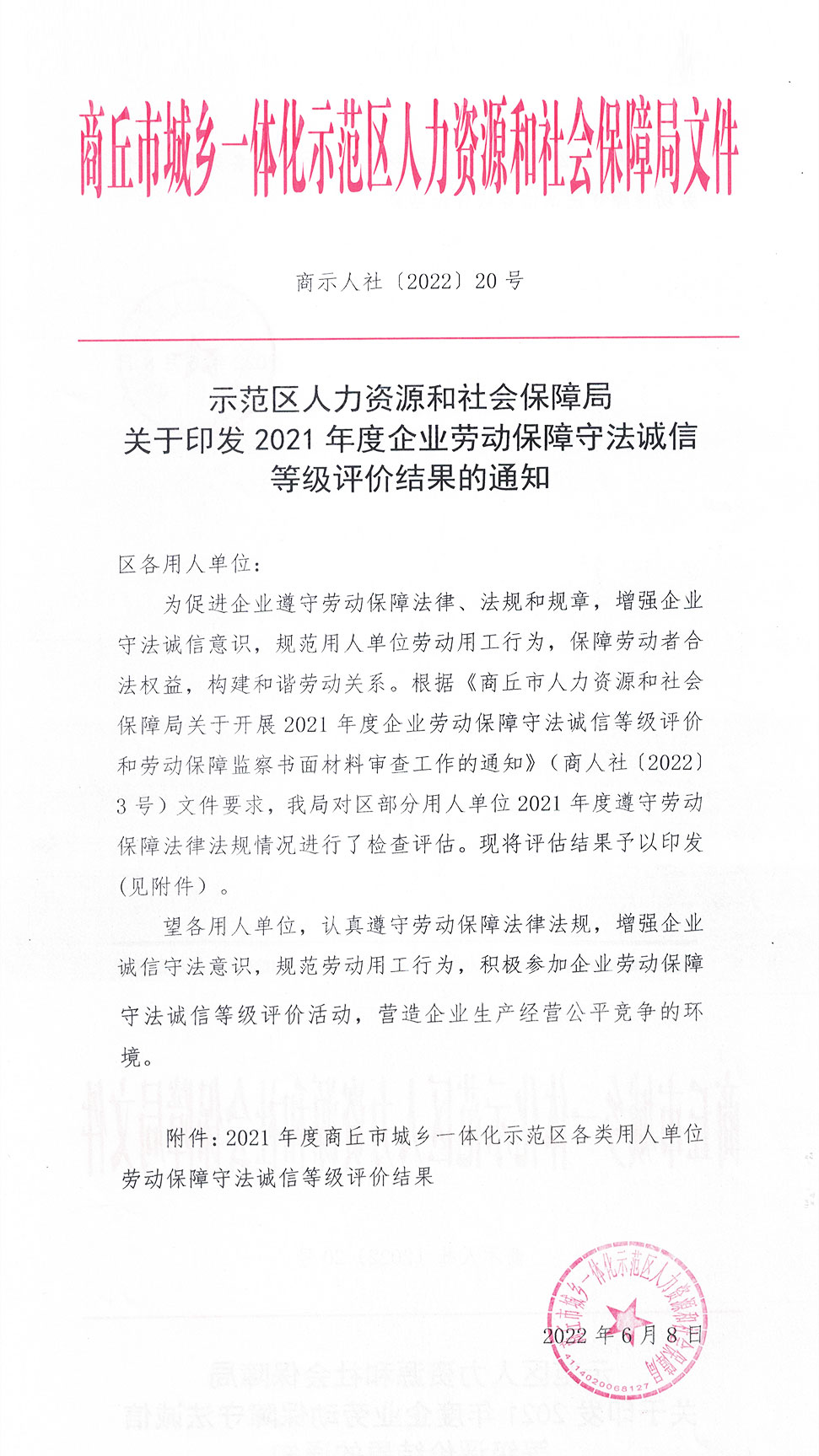 近日,商丘市示范區(qū)人力資源和社會保障局公布了《關(guān)于2021年度商丘市城鄉(xiāng)一體化示范區(qū)各類用人單位勞動保障守法誠信等級評價結(jié)果》,我公司再次被評為示范區(qū)勞動保障守法誠信A級示范單位,這一榮譽(yù)充分表明了勞動保障部門對公司勞動管理規(guī)范與員工權(quán)益保障等方面工作的充分肯定。